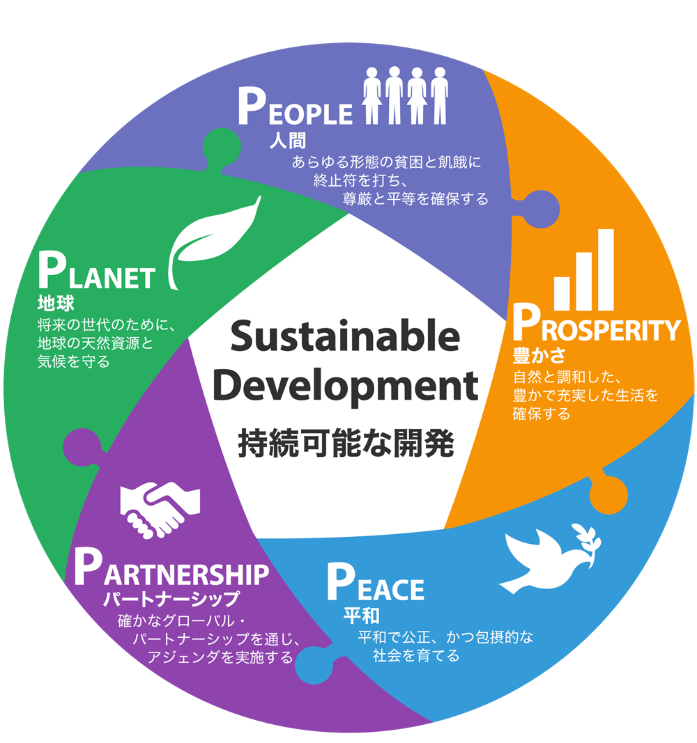 人間、豊かさ、地球、平和、パートナーシップという5つの要素であると捉えることができます。